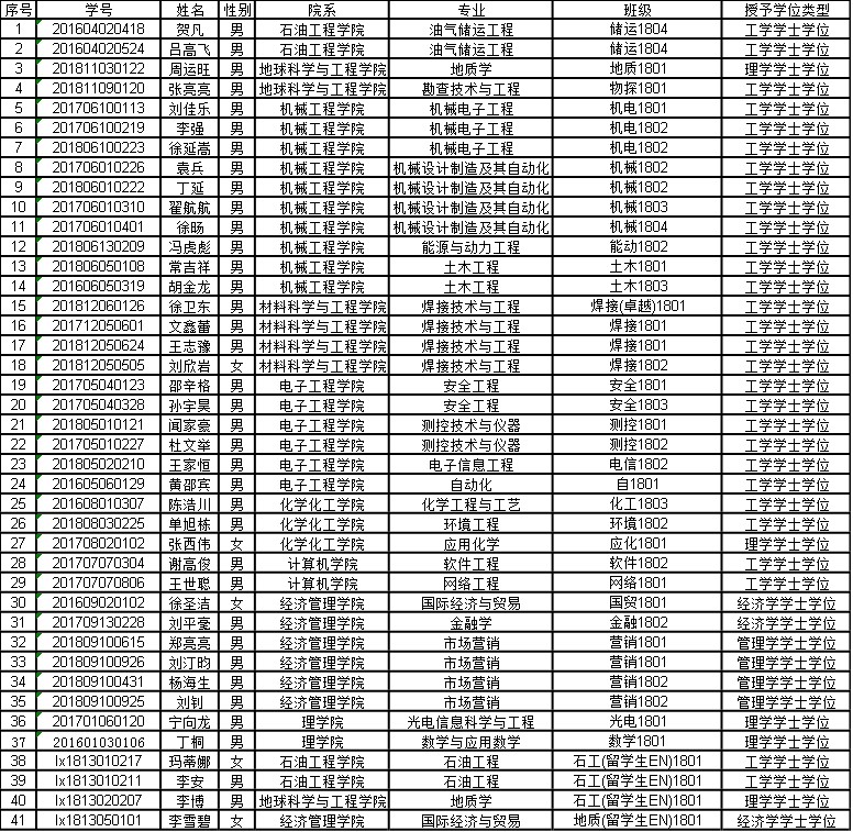根据《中华人民共和国学位条例》《西安石油大学学士学位授予工作实施细则》(西石大教〔2019〕230号)《西安石油大学国际学生学士学位授予工作细则》(西石大外〔2021〕135号)的有关规定,经校学位评定委员会2022年9月28日会议审议通过,决定授予贺丹等37名2022届普通高等教育本科毕业生、玛蒂娜等4名2022届国际学生学士学位。