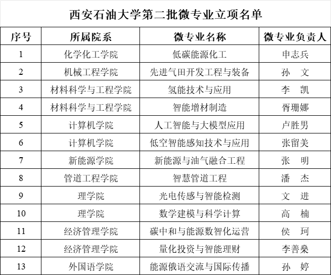 根据《关于开展西安石油大学2025年第二批微专业建设立项的通知》要求,学校组织开展了申报及评审工作。经学院申报、形式审核、专家组论证及评审等环节,拟立项“低碳能源化工”等13个微专业为学校第二批微专业建设项目,现将结果予以公示,名单请见附件。