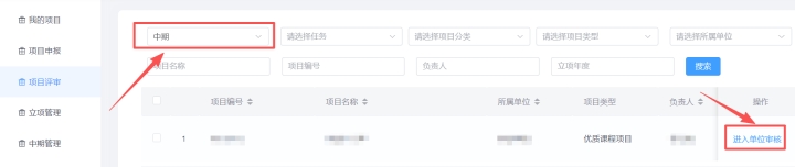 【操作步骤】学校官网-教务处-泛雅平台-教科研管理-工作台-项目评审-选择项目阶段-中期-进入单位审核。